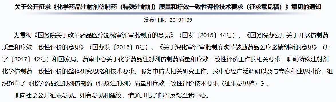 化学药品注射剂仿制药(特殊注射剂)质量和疗效一致性评价技术要求(征求意见稿)