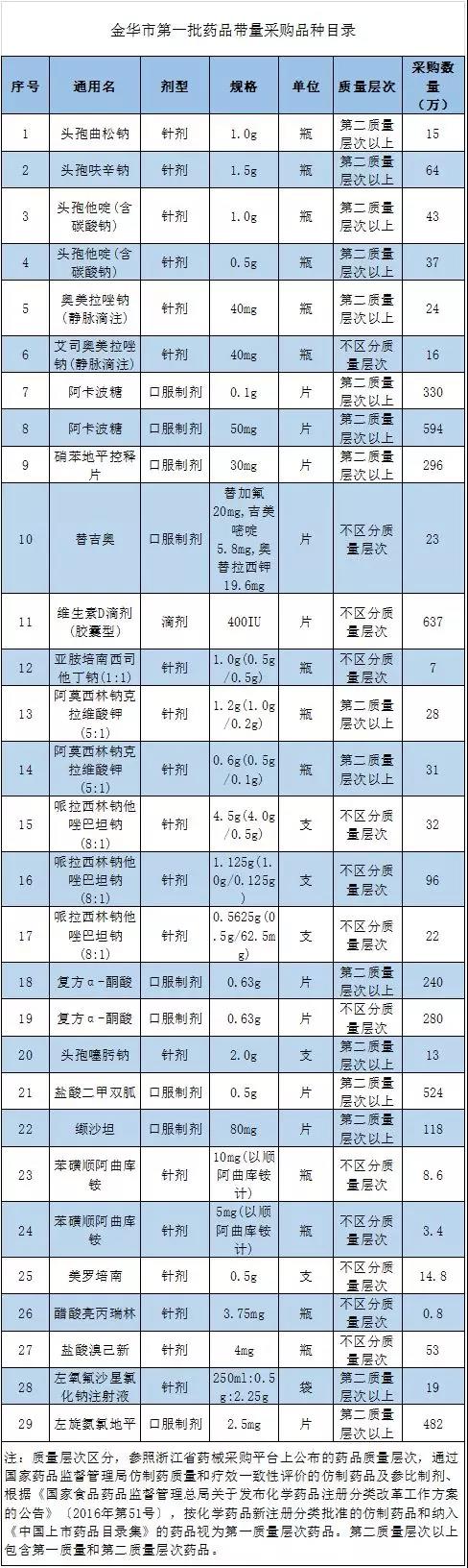 日前,浙江省金华市人社局发布《关于开展金华市第一批药品带量采购的公告》,29个大品种采购量公布:头孢曲松钠、阿卡波糖、缬沙坦……(详见附件)。