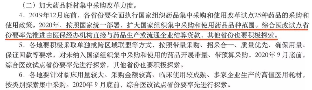 2020年,按照国家统一部署,扩大国家组织集中采购和使用药品品种范围。综合医改试点省份要率先推进由医保经办机构直接与药品生产或流通企业结算货款,其他省份也要积极探索。