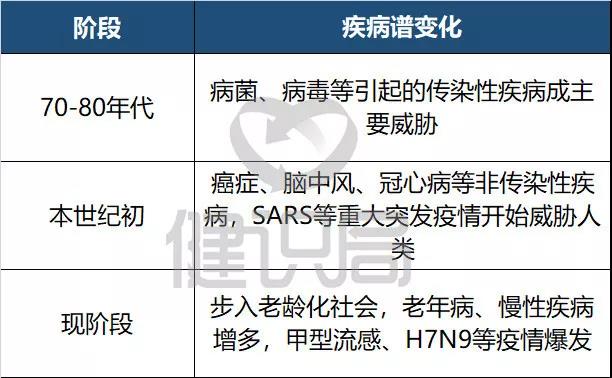 中国人口老龄化使疾病谱发生了明显的变化,从全国的五次卫生服务调查变化趋势显示,人口老年化已经促使与老年人密切相关的肿瘤疾病、内分泌营养代谢病(如糖尿病等)、循环系统疾病(心血管、脑血管)、类关节炎等病症的患病率迅速增加。