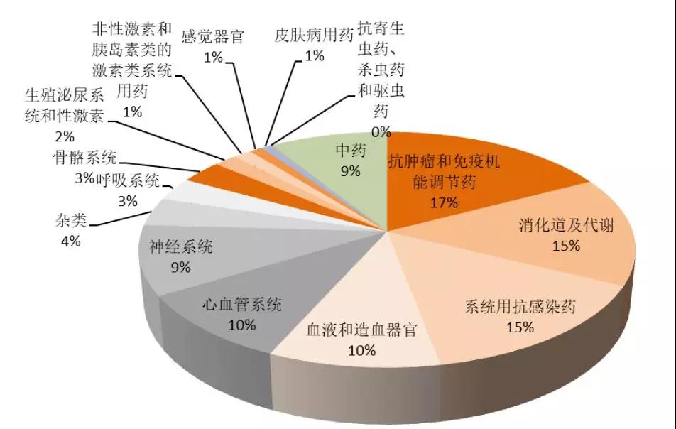 2018 年样本医院整体市场规模为 2368 亿元,以慢病为主的肿瘤、免疫性疾病、心血管系统、神经系统等几类疾病用药市场近四成。其中,最大的品类是抗肿瘤和免疫机能调节药物,占比 17%;其次消化道及代谢药占比 15%;心血管系统和神经系统也分别占比10%、9%。