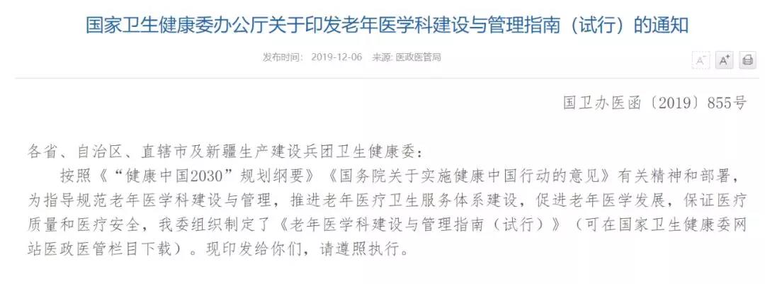 为指导规范老年医学科的建设与管理,推进老年医疗卫生服务体系建设,促进老年医学发展,保证医疗质量和医疗安全,12月6日,国家卫生健康卫生委员会发布了《国家卫生健康委办公厅关于印发老年医学科建设与管理指南(试行)的通知》,鼓励有条件的二级及以上综合性医院要开设老年医学科,并对全国老年科的设立和管理发布规范,并且要将其建设成为与医院儿科、妇科并列的科室。