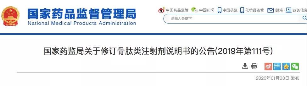 1月3日,国家药监局发布《关于修订骨肽类注射剂说明书的公告(2019年第111号)》,决定对骨肽类注射剂〔包括骨肽注射液、骨肽氯化钠注射液、注射用骨肽和注射用骨肽(Ⅰ)〕说明书【不良反应】、【注意事项】等项进行修订。