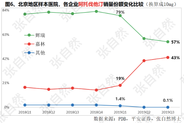 以北京样本医院市场为例,阿托伐他汀一直由辉瑞独霸市场,但4+7没能中选,而由北京嘉林药业的中标,所以自去年一季度末4+7试点在北京实行后,辉瑞的市场份额迅速由一季度的79%下降到三季度的57%,下降了22个百分点,而北京嘉林的份额则由一季度的19%上升到三季度的43%,增加了24个百分点。